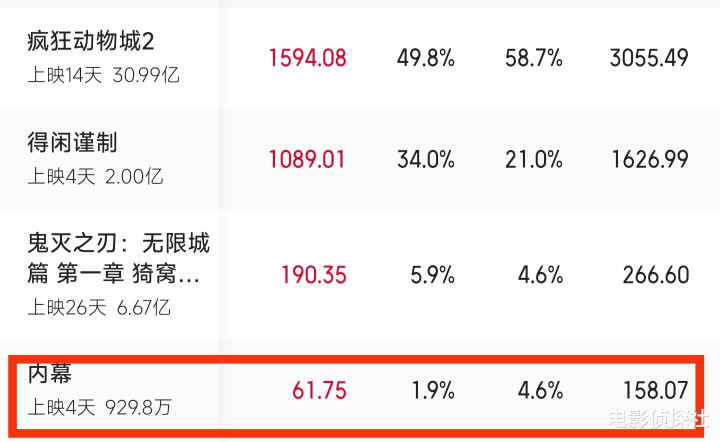 可就是这样一部演员阵容豪华的影片,在上映之后票房却十分惨淡,该片上映4天累计票房仅有925万,单日票房更是只有57万,排片占比只有可怜的4.6%,简直让人大跌眼镜。